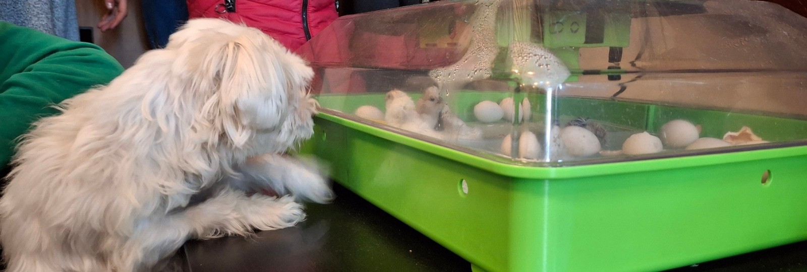 Zapewniamy Was, że pisklaki cieszą się ogromnym zainteresowaniem i ciężko oderwać od nich uczniów. Nawet nasz farmerski pies shanti robi wszystko żeby przyjrzeć się temu zjawisku, czasem tylko wzrost mu nie pozwala :)